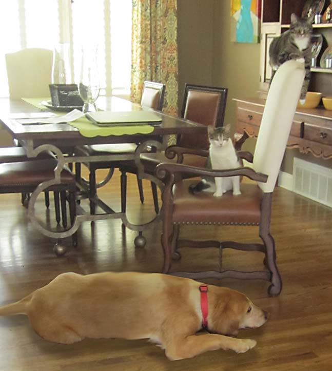 This past week of house sitting and pet keeping has been quite interesting . Anytime I sit which is quite often soon the full managerie is present . The dog at my feet pushing tight against me. Comet (Callie's cat) is on the arm of the couch touching my shoulder. Stripes the older cat is on the back of the couch resting on my shoulders . All seem contented to just have human contact and can stay there for as long as I 'm there reading or just watching the world go by as they say.